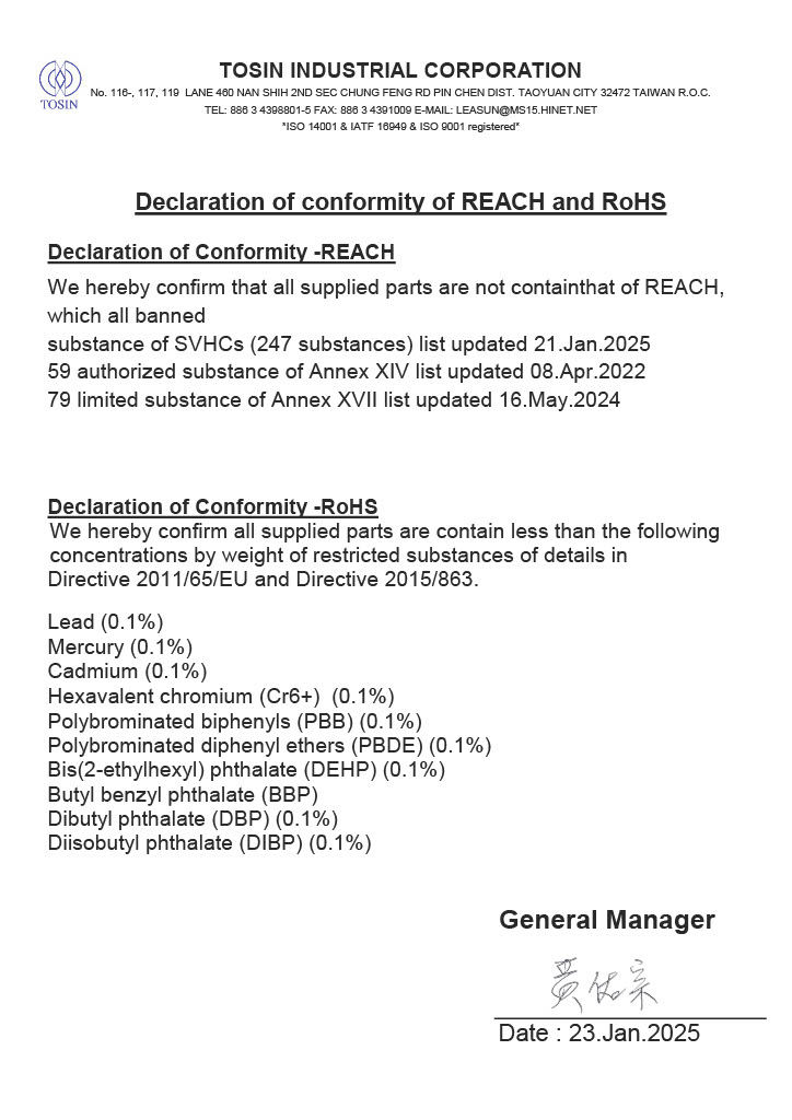 All products have been manufactured comply with “RoHS2 EU Directive 2011/65/EU and RoHS3 EU Directive EU/ 2015/863”.